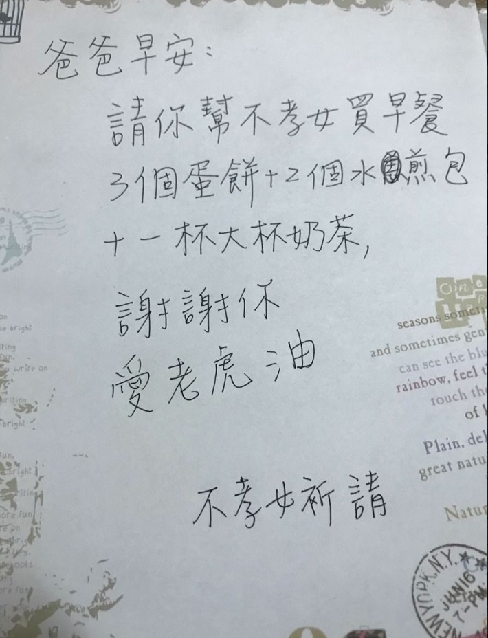 這名女網友Dcard發文表示「之前跟父親吵架,與其說吵架,不如說是他認為我不聽他話,鬧點小脾氣罵我是不孝女,但這不打緊,這是父女間的小小打鬧。」隔天就留紙條給老爸「爸爸早安,請你幫不孝女買早餐,3個蛋餅+2個水煎包+一杯大杯奶茶,謝謝你,愛老虎油,不孝女祈請」,父親起床後便依照指示買早餐