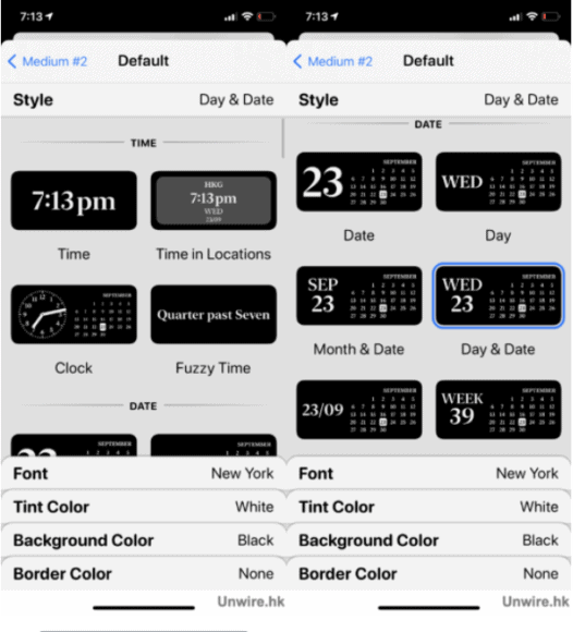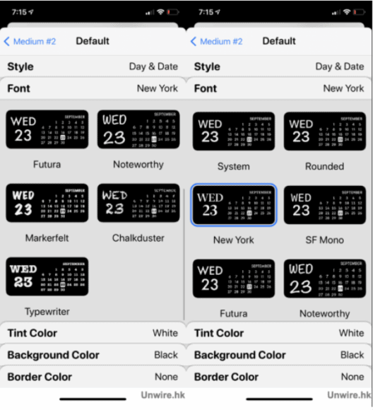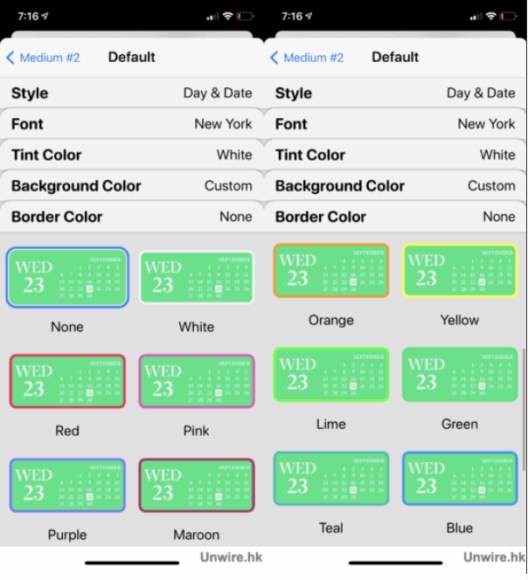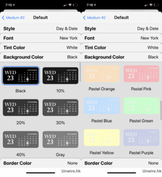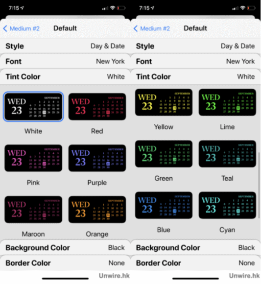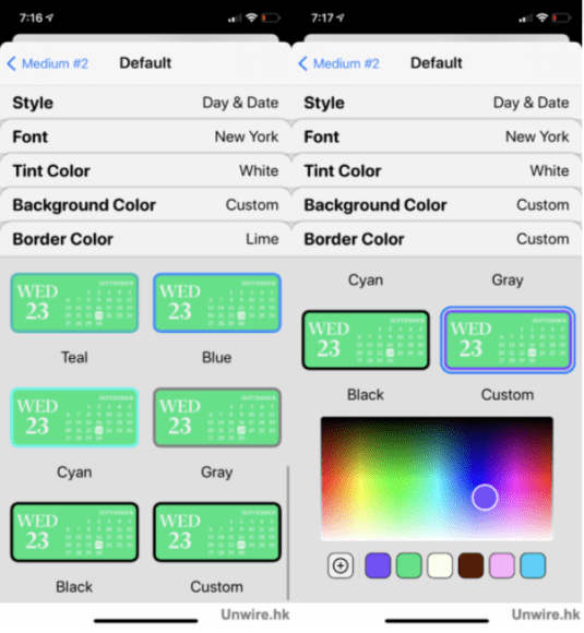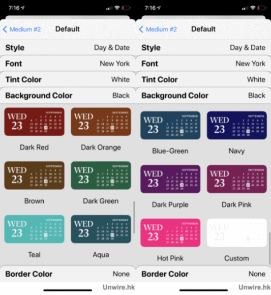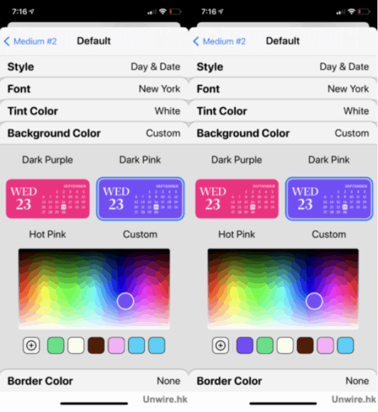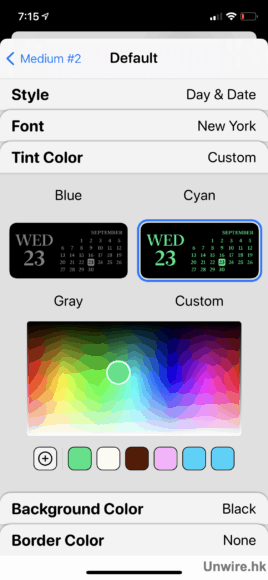 當選好字型後,便輪到選字體顏色了,Widgetsmith 預設了不少顏色讓用戶選擇,可以從中選取其一,又或拉到最尾「Custom」透過調色盤自訂顏色。