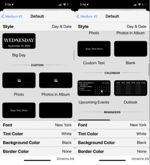選擇想要的 Style,而 Widgetsmith 有多款模版可供用家選擇,包括 Time(時間)、Date(日期)、Custom(自訂)、Calendar(行事曆)、Reminders(提醒)、Weather(天氣)、Health & Activity(健康與活動)、Tides(潮汐時間)、Astronomy(天文)等,而當中天氣的 Widget 需要付費解鎖,若然希望免費使用的話,可以選用其他類別的 Widget,例如自訂可以讓用家放照片或文字在畫面上。今次我們就示範加入一個 Calender 月曆小工具。