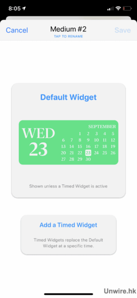 打開 Widgetsmith,裡面會看到分別有「Small」(2×2 Apps 排列)、「Medium」(4×2 Apps 排列)、「Large」(4×4 Apps 排列)的 Widget。選定你要的大小,小編今次為大家示範製作一個 Medium 的長方形日曆,先點開「Add Medium Widget」。之後會彈出一個全新的 Widget 方格,這便是待會我們的作品了。