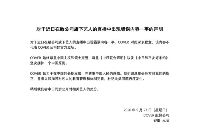 雖然兩位 VTuber 在其後已刪除了直播片段,且其 bilibili 直播空間亦遭到封鎖,但中國網民仍然不滿,令母公司 COVER 終於在周日(27 日)發布官方聲明,以 VTuber 在直播期間的不適當發言,以及公布頻道經營的機密情報為由,向兩人處以停止活動 3 週的處罰。