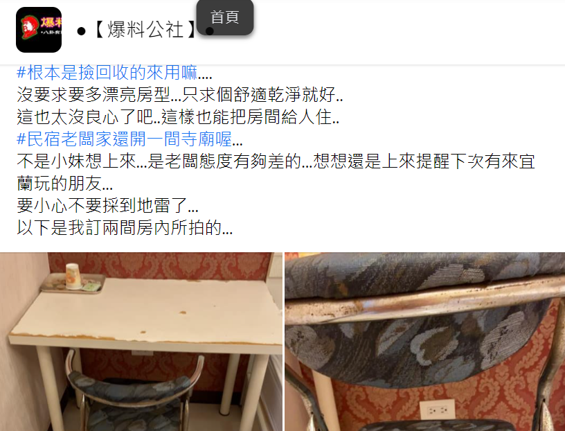 誇張的是,跟民宿老闆反應後,對方的態度卻很差,讓她完全無法接受,而且對方的另一個身分,居然還開了一間宮廟,傻眼表示:「沒要求要多漂亮房型,只求個舒適乾淨就好,這也太沒良心了吧,這樣也能把房間給人住!」決定把所有事情PO上網路。