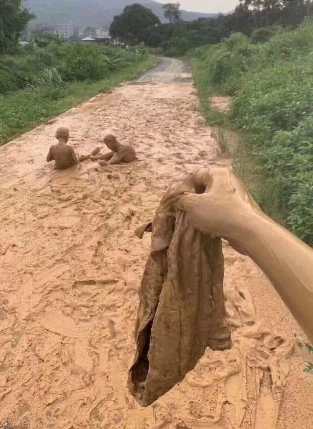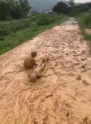 這2尊互動感十足的銅像,雖然樣子很逗趣,但所在的位置竟然是馬路中間,這就有點不太對勁了,不過還沒等眾人開始討論,原PO就在接下來的幾張照片中,揭曉了答案。原來他們並不是什麼怪異的銅像,而是因為在泥巴裡翻滾、玩耍,導致全身沾滿了泥土的頑皮小孩。而看到大家的衣服都染成了一片金黃色,原PO也忍不住擔憂道:「回家以後,媽媽一定會很生氣!」