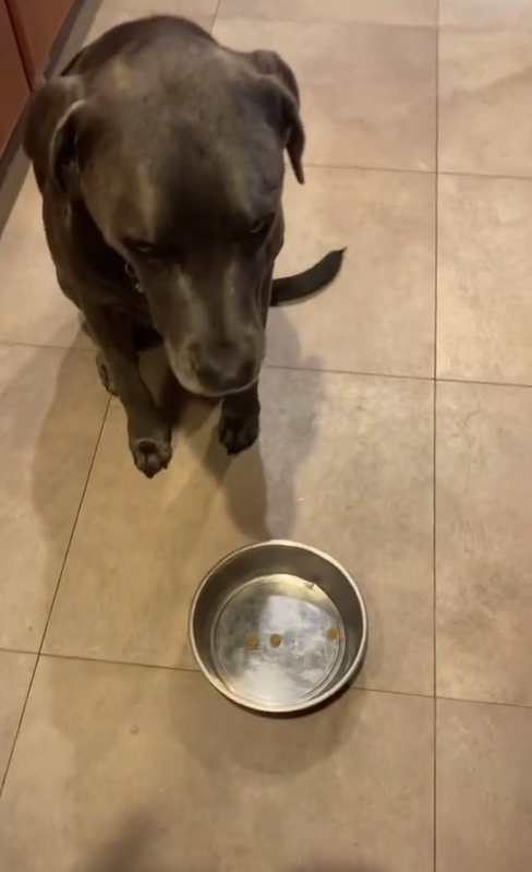 影片中狗狗滿心期待地在等主人放飯,但馬麻卻只放了三顆飼料到碗裡,只見狗狗先是露出傻眼又無奈的表情以表達牠無聲的抗議,接著還直接跑走,可以感覺得出來牠對於今天晚餐的份量很不滿意,狗狗跑走後還回頭看馬麻有沒有多加一些飼料,結果碗裡依然只有那三顆。