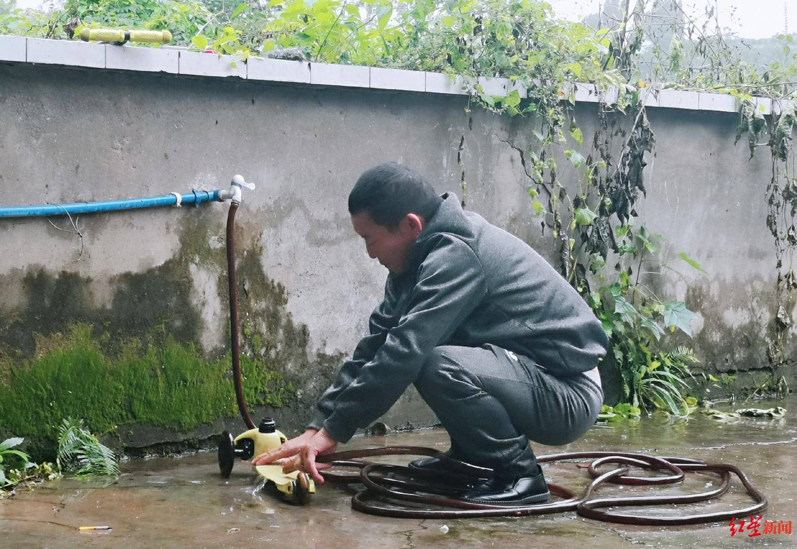 去貴州前,老王仔細清洗孫子最愛的滑板車