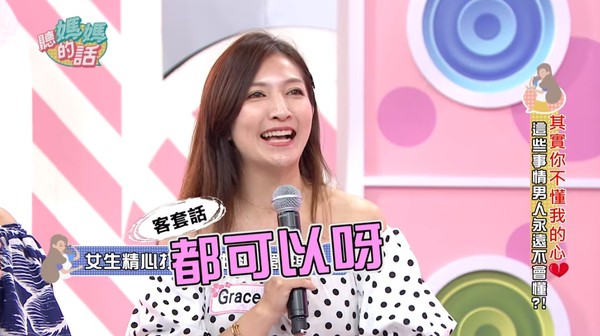 Grace最近上《聽媽媽的話》大談和阿翔的婚姻,Grace表示生氣的時候,只想要自己冷靜一下,但丈夫完全不能理解,堅持要當下就把話講清楚,甚至會擋住門口逼Grace與自己和好;在Grace睡著時將她搖醒談話,讓她非常不能接受。Grace更抱怨阿翔「不知道是真不懂還是裝不懂」,當自己精心打扮之後,期待能和阿翔來場浪漫的晚餐約會,結果自己只是客氣一下的表示吃什麼都可以,沒想到阿翔竟說:「那我們去吃炒飯!」讓她氣壞了。
