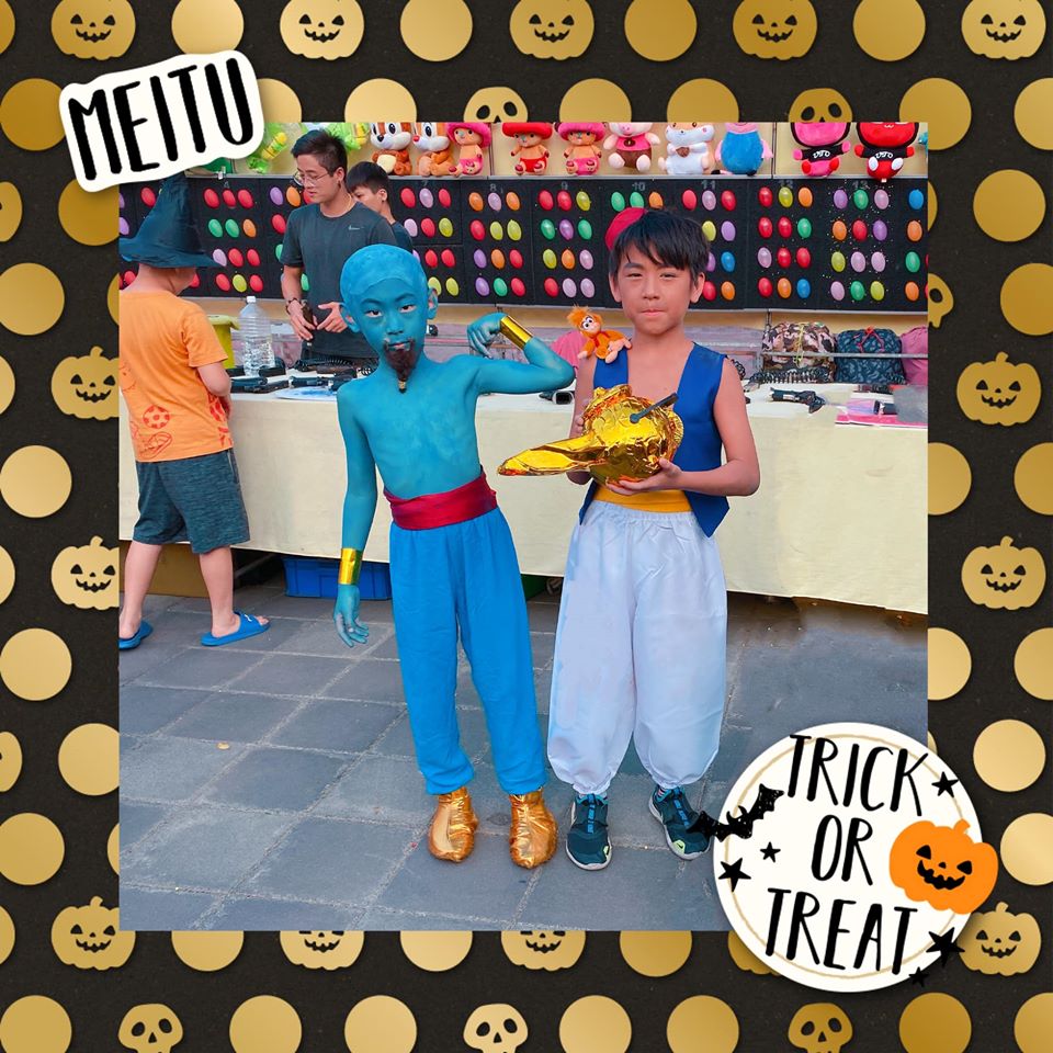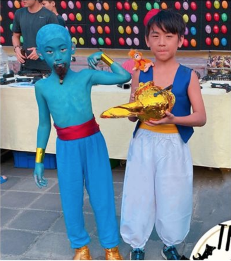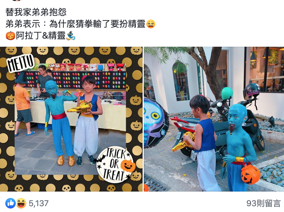 接受ETtoday採訪的媽媽Winnie Wen表示,為了讓兩寶能留下萬聖節的難忘回憶,她花了整整兩個小時幫他們做造型,「弟弟是找相似的服裝,藍色燈籠褲和紅色腰封搭配;哥哥則是買現成的阿拉丁服」。而除了整個過程相當幽默之外,最好笑的是弟弟在被塗上藍色顏料後,才瞬間傻眼大叫:「我怎麼都變藍了!」