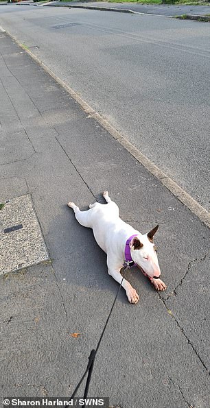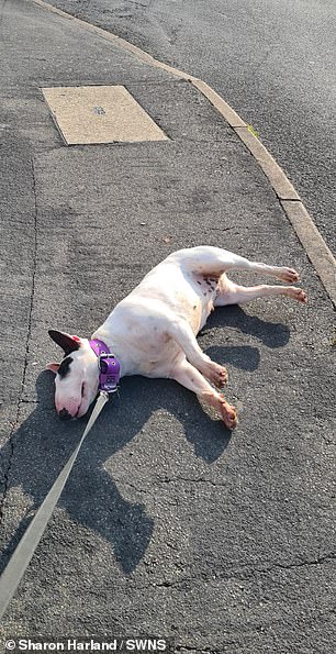 2020年10月06日這隻狗狗戲太多啦~英格蘭萊斯特郡欣克利(Hinckley)35歲網友Sharon Harland養了一隻叫Fidge的2歲迷你牛頭梗。Fidge聰明活潑,但有時候非常頑固,比如外出散步時牠經常會耍賴,躺在地上「裝暈」不肯回家,讓主人很無奈。