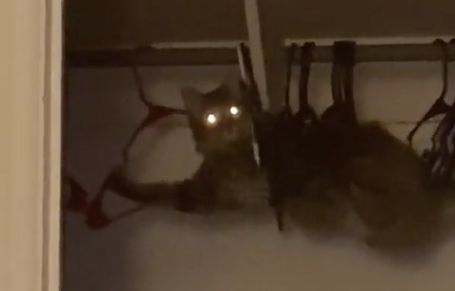 這時一隻眼睛發光的生物看向這邊,原來是調皮的Potato又在搗亂!這次牠從馬麻的行李箱上跳進衣櫥裡,接著還爬上吊衣架上,開始開發「極限體能王」的攀爬項目,畫面實在太逗趣讓馬麻立刻拿起一旁的手機開始錄影。