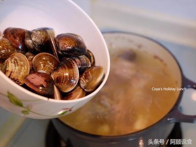 4.開蓋改中大火下蛤蜊,煮到中滾就關火蓋上蓋子悶一下,用悶的把剩下的蛤蜊悶熟(開嘴),蛤蜊肉才不會縮水老掉,最後下點米酒、鹽巴試味道就完成囉!
