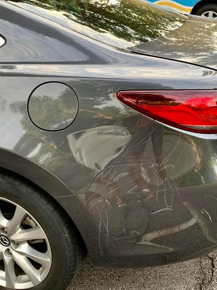 當然被孔雀氣噗噗地連抓了好幾下,車身的烤漆下場可想而知,就變成這副悽慘的模樣啦...車主看到都要哭了吧,還沒辦法求償啊QQ