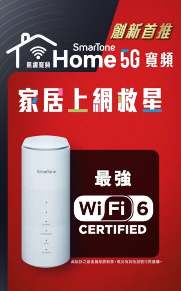 SmarTone 正式推出 Home 5G 寬頻服務,為本港首家推出極簡便家居上網體驗,並提供最佳的整體 5G 網絡體驗。全新服務月費只需港幣 148 元便可享無限 5G 數據(200 GB 全速數據),並可以優惠價加購指定型號之 Wi-Fi 6 路由器,插電即用、免拉線、免安裝,即可以 5G 極速上網。