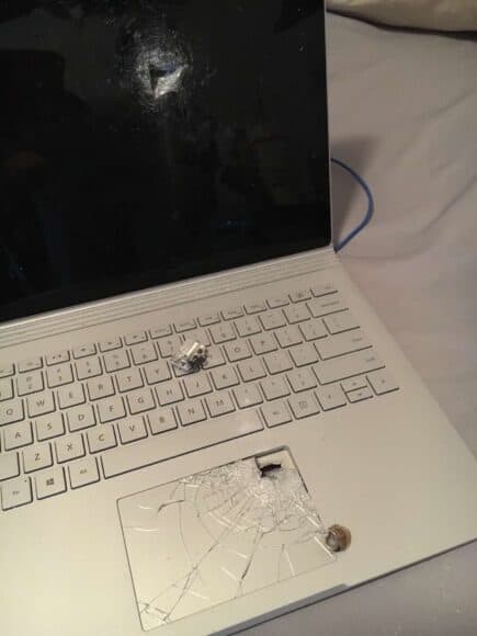 Aaron 表示住在他樓下的住客向天花板開槍,結果子彈打穿了他家的地板和睡床,而子彈剛好被 Surface Book 3 停住了。圖片可以見到 Aaron 的 Surface Book 3 觸控板被子彈打穿了,而屏幕亦留下了一個彈孔,彈頭則留在筆電內。