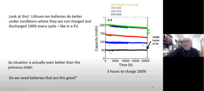 他現時的實驗更推翻了他和團隊在上年論文中提出的「百萬英里」電池理論,當中提及電池可以循環使用 5,000 次,但現時該測試電池已經向着 10,000 到 15,000 個循環進發,同時實驗發現鋰離子電池的退化率及損耗率亦很低。