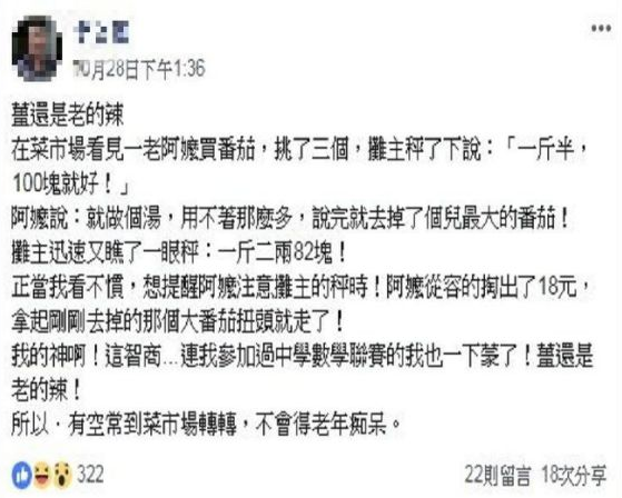 正當原po想要上前提醒阿婆小心老闆的詭計時,阿婆立刻從容地掏出18元,拿了剛剛去掉的番茄轉身就走,一招就把老闆輕鬆KO掉了!原po發文時忍不住寫到:「我的神啊!這智商...連我參加過中學數學聯賽的我也一下蒙(懵)了!薑還是老的辣!所以,有空常到菜市場轉轉,才不會得老年痴呆」笑翻所有人。