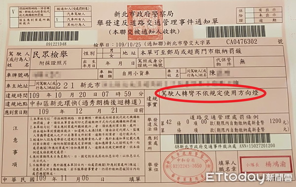 據《ETtoday》報導,日前有名小貨車駕駛,行經新北環快迴轉道的時候,當下只有一條道路,他也都順著地上箭頭的方向緩緩轉彎前進,然而不久後收到一張罰單,上面寫著「不依規定使用燈光」,讓他實在是一頭霧水,後來才知道,原來是在迴轉的時候沒有使用方向燈,才會吃上罰單。