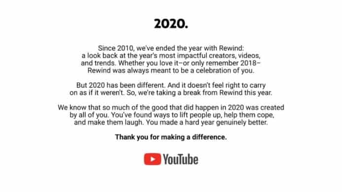 YouTube 在官方 Twitter 帳號表示,儘管今年發生過不少好事,但 2020 年始終有點不同,認為並不是好的時機去進行回顧,所以宣佈 Rewind 活動停辦一年。以往 YouTube 會從全球創作者的影片中,抽取部份影像和片段,反映該年發生過的大事,雖然 YouTube 未有明言是什麼導致 Rewind 活動取消,明顯地就是與武漢肺炎疫症全球肆虐有關。