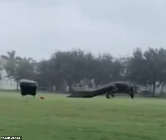 ▼當時颶風伊塔(Hurricane Eta)登陸佛羅里達州,那隻3公尺長的巨大鱷魚在空無一人的高爾夫球場中漫步。