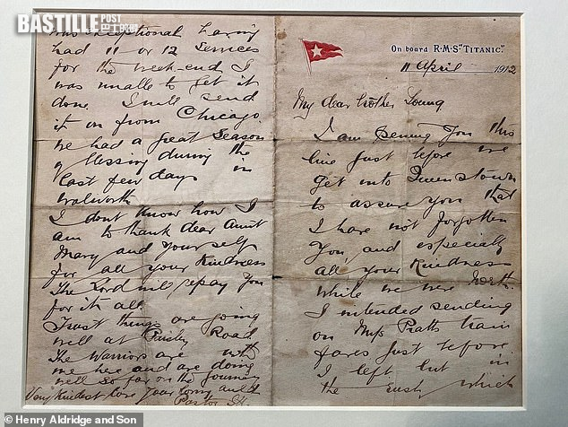 此次將被拍賣的信件是哈珀在沉船的三天前用鐵達尼號信紙寫下的,他在信中感謝另一名傳教士在他離開倫敦前給予幫助,信中寫道「我親愛的兄弟楊(Young)。我要在抵達皇后鎮前寫信給您,以證明我並沒有忘記你,以及我們在北方時您給予的善意。...戰士們始終與我同在,旅途一切順遂。」