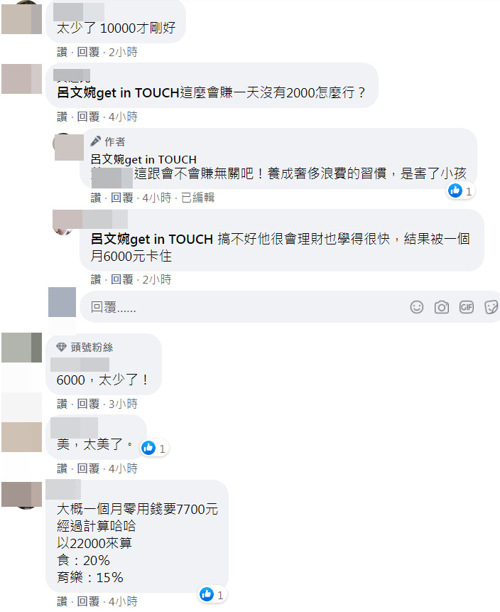 對於很多網友疑問:「我家女兒一天就要用掉400元,感覺一個月4000真的少!」、「高中生就不只了,感覺大學要1萬元才夠吧!」、「大學很多活動的,6000元真的會不夠!」也有網友表示,「明明賺這多,卻只給女兒6000,是不是不太疼愛啊哈哈?」呂文婉聽到後,也表示「其實這跟會不會賺無關」,認為如果讓孩子養成奢侈浪費的習慣,反而是害了他們,所以才會堅持每個月只給6000元,讓他們自己分配。