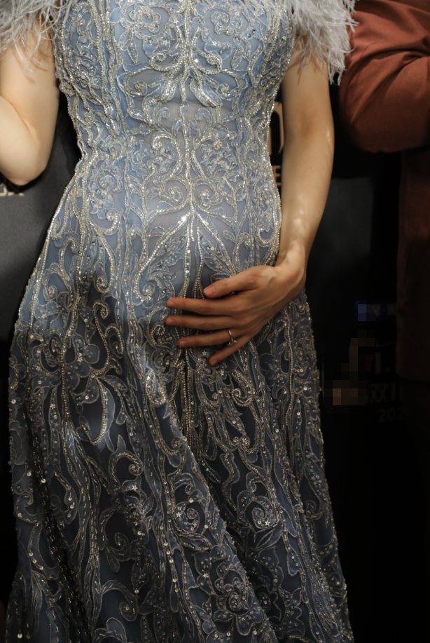 只見,當天吉娜一身藍銀色禮服,挽著老公郎朗在紅毯上站定,正面亮相跟大家打招呼的時候,感覺吉娜的腰身似乎都沒什麼變化,依舊是螞蟻腰。