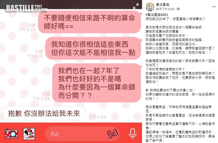一名女網友日前於Facebook專頁「靠北星座」投稿,問道:「現在都2020年了,怎麼還有人相信算命?」她表示與男友拍拖已7年,感情穩定即將於明年結婚,但早前男友跟他朋友找了一個算命師傅問卜,期望算一下二人的未來。未料男友回家後對她的態度180度改變,更吵著要求分手及取消婚禮。