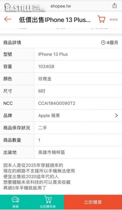 一位女網友最近在社交網站發文分享自己在逛購物平台「蝦皮」時遇到的趣事。她發現有位自稱來自2025年的未來人賣家在低價出售「iPhone 13 plus」,不僅po出手機實物照,還詳細羅列出手機的規格,令她大呼「有趣」。