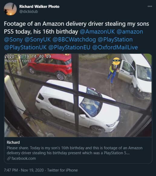 據外媒 Eurogamer 報導,該名客戶的丈夫在社交媒體發佈閉路電視錄像,顯示貨車司機在貨車後方捧著一個疑似裝有 PS5 的大盒,之後他運送其他貨件予家中後,又將該大盒搬回和駛走,最後 PS5 並沒有送到家中,而該名客戶聯繫了Amazon 後,Amazon 表示會對 PS5 被盜竊一事進行調查,而該名客戶由最初的 5 英鎊禮券賠償,變為最後獲得 50 英鎊的禮券作為賠償,該名客戶亦只可以透過其他途徑購回 PS5,甚至可能要以更高價錢購回。