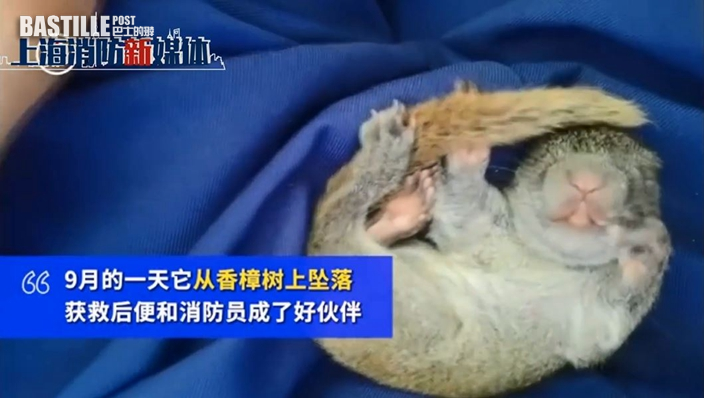 上海一家消防局上月發現有隻初生松鼠從樹上墮地,消防員見狀把牠救起並細心照顧,如今小松鼠已長大不少,身體十分健康,不時在樹上玩耍,把消防局當成自己家般自由進出,也相當黏人,會躲在消防員制服的口袋。不少網民也大讚頓成「奶爸」的消防員十分暖心。