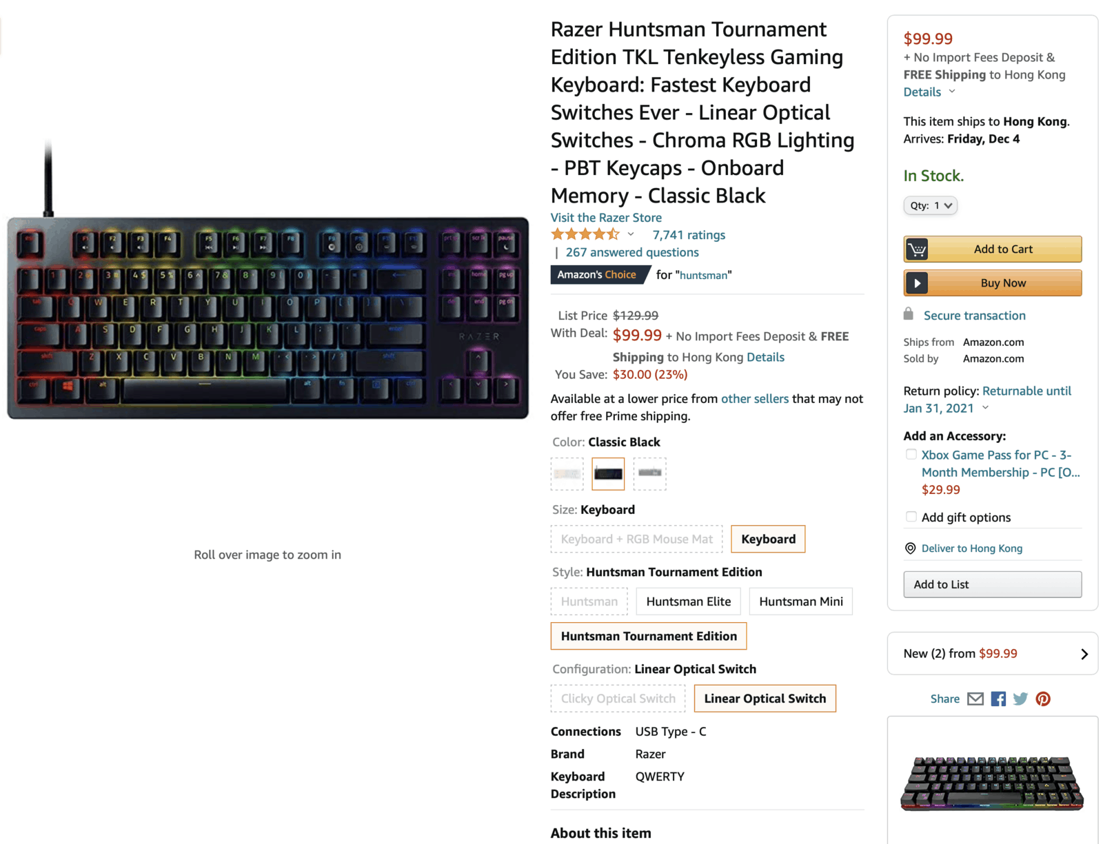 機迷有時候在 Black Friday ,亦有意外收鑊。不少大牌子的電競鍵盤及電競滑鼠等都有減價,官網原價 HK$1399,Amazon 折扣後則只需 US$ 84.99(折合約 HK$670),差不多是半價優惠,而且一件已經足夠免運費送到香港,真的非常吸引!假如讀者是 Razar 愛好者或者是想以平價購入電競機械鍵盤,這個亦是入手好選擇。不過讀者要留意只是機械式綠軸有如此便宜的優惠,其他軸式減價較少。