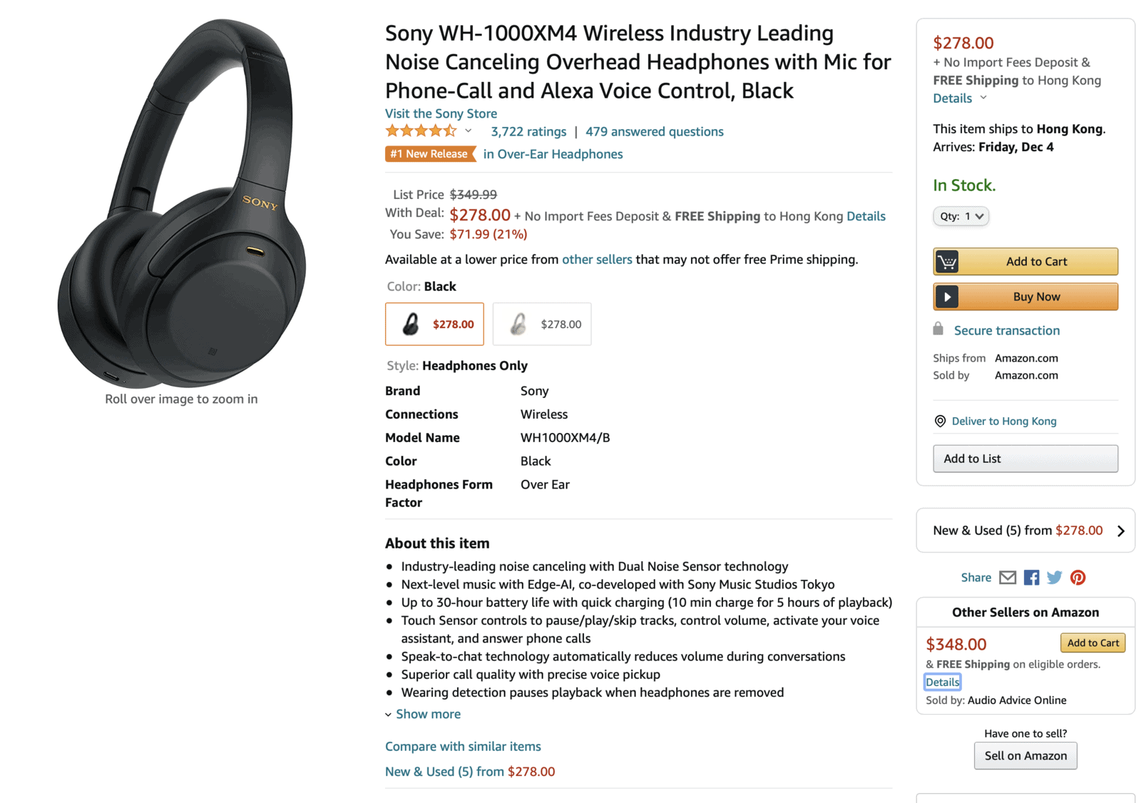 現在無線耳機大行其道,不過未必每個人都喜歡入耳式耳機。如果你對音質有些要求,又想添置一個無線耳機,Sony 這個 WH-1000XM4 也有頗吸引的折扣優惠,香港官網的建議零售價是 HK$2890,在 Amazon 則賣 US$ 278(約 HK$2154),就是約八折優惠,非常吸引。