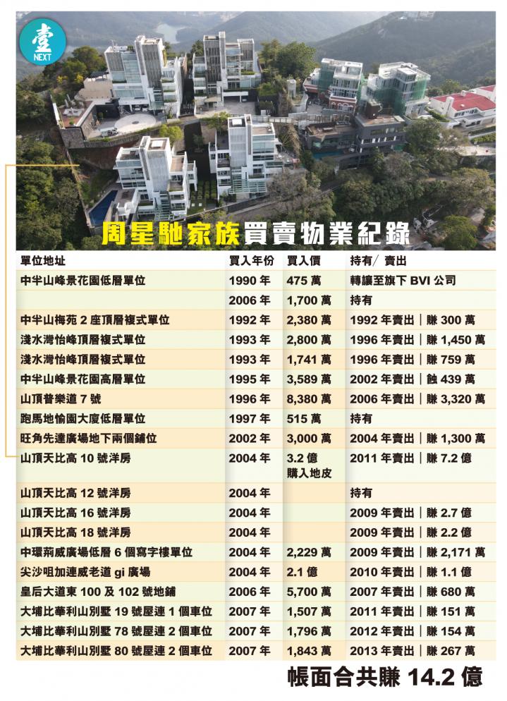 上市公司無發圍,周星馳只好抓著現持物業作救命繩。但時至今日,其在港的大部分物業已賣走。星爺家人依然報住他發跡時買入的中半山峰景花園單位;該單位於2006年以1,700萬轉至周星馳胞姊周文姬的BVI公司名下,現市值5,000多萬。除了家人自住單位,周家另持有63年樓齡的跑馬地愉園大廈低層單位。大廈最近一次成交已是兩年前的事,單位估計市值約1,800萬。