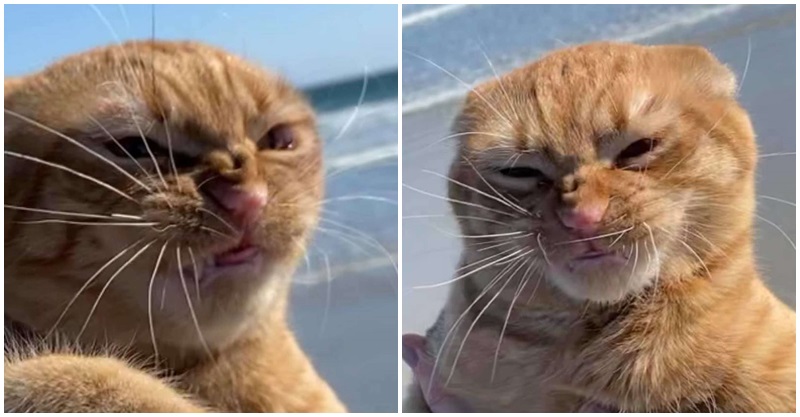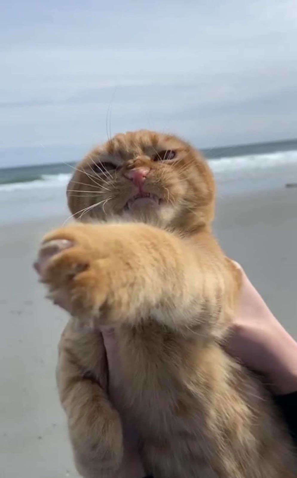 第一次到海邊「遭狂風逆襲」!橘喵臉臉「全被吹歪」耳朵消失:朕跟你拚了!