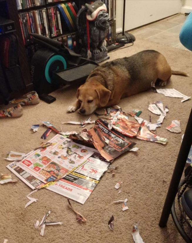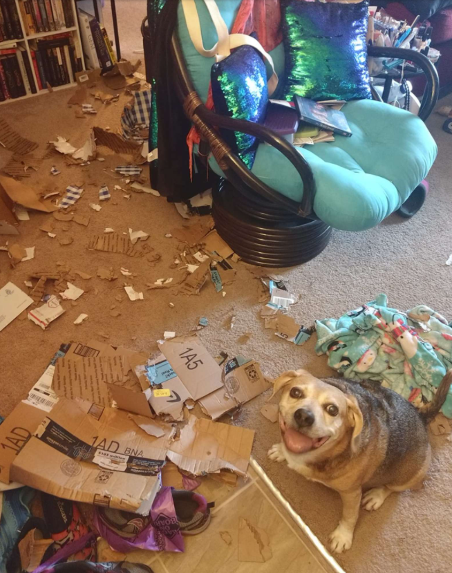 最近,有天凱西臨時有工作,但來不及把JJ送到狗狗日托中心,她想說JJ其實好一陣子沒拆家了,讓牠獨自在家應該沒問題吧?結果一切都是假象,因為當她一回家,JJ就給了她一個「大驚喜」——牠窩在一片混亂中燦笑看著她,還一副特別驕傲自豪的模樣XDD
