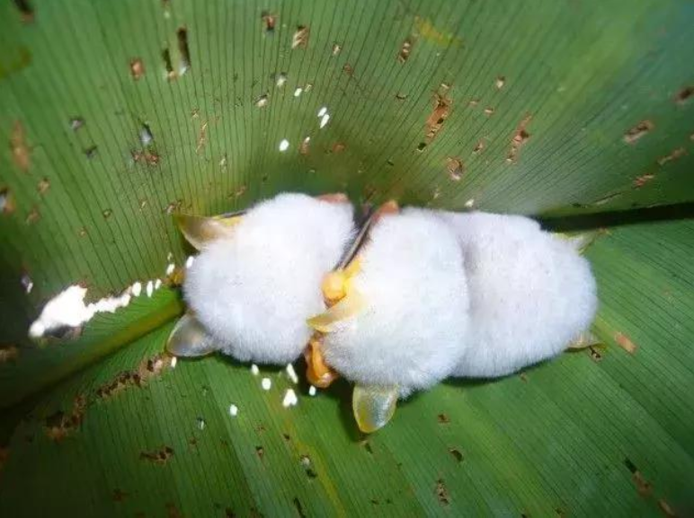 ▼這種蝙蝠是白色的,全身毛茸茸的。牠們體內有大量類胡蘿蔔素,鼻子和耳朵是鮮豔的橘黃色,看起來很可愛。