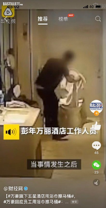 近日網上流傳一則影片,揭露全球最大酒店集團萬豪旗下一家位於深圳的五星級酒店彭年萬麗酒店的服務員,清潔廁所時在地上拾起一條浴巾,然後擦馬桶,另外又用一條毛巾隨意抹漱口杯,並沒有回收消毒,令不少網民震驚。彭年萬麗酒店工作人員回應指,對事件感到抱歉,強調屬員工私自違規操作。酒店管理層對客房部員工再次進行培訓,並作出相應的處罰。