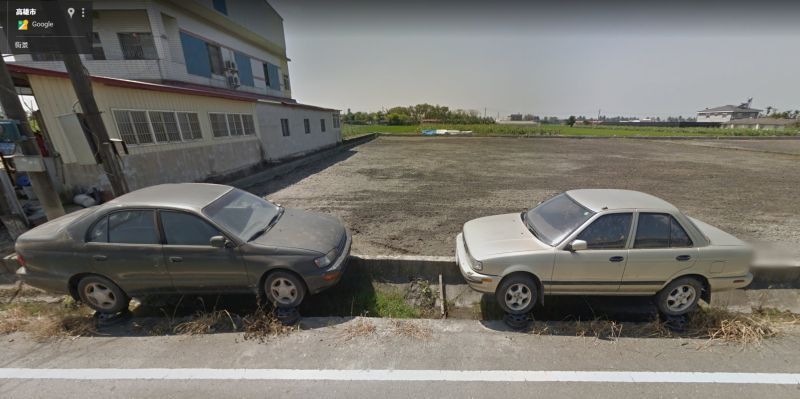 ▼有網友po出從另外一個角度拍攝的照片,原來這2台車是停放在廢輪框上的。這是用堆高機把報廢車堆上水溝的,平常還可以拆用車上的零件:「我認識住鄉下的,車子真的還停這樣,說這樣保養超級方便,而且還能自己洗底盤,我還挺羨慕的」