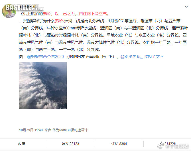 近日,在微博上有一位網友貼出一張從飛機上航拍的秦嶺照片,相中壯觀的秦嶺山脈阻擋住其中一側的雲層,並表示「飛機上航拍的秦嶺,以一己之力,擋住南下冷空氣」。發問者也解釋了秦嶺-淮河一線作為南北分界線,將中國大陸劃分為不同降水帶、濕潤帶、溫度帶、風帶,並對農業以及農作物種植也帶來的巨大影響。