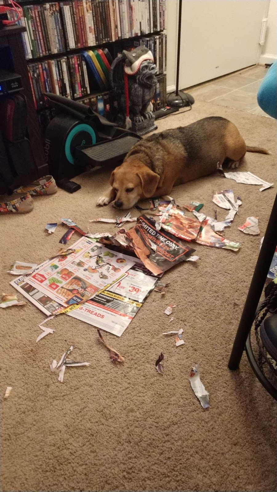 ▼Lewis說:「我一開門,看到的就是一片混亂!牠咬爛6個紙箱,全都撕成碎片;打開廚房的安全門,破壞垃圾桶,幸好沒有把垃圾弄得到處都是。」Lewis頭疼地看著眼前的一切,J.J.卻非常驕傲。牠坐在垃圾堆裡,臉上掛著燦爛的笑容,似乎在向Lewis介紹自己的成果:「這是我的藝術創作,是不是很棒?」