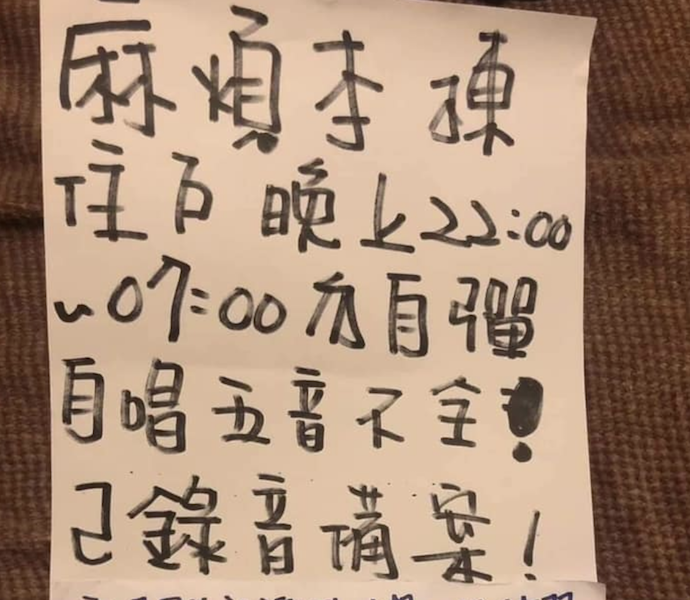 根據《Oops!新鮮事》報導,這位網友在臉書「爆廢公社」中發文,表示日前回家,發現大樓佈告欄上多了一則公告,猜測是某位鄰居受不了了,決定寫親筆信警告,「麻煩本棟住戶晚上10點後勿自彈自唱,根本五音不全!」接著還強調自己已經錄音備案,希望對方可以小心自重。
