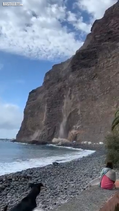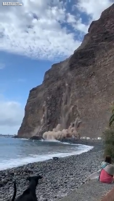 11月14日下午,在著名的度假勝地拉戈梅拉島(La Gomera's island)巴耶格蘭雷伊(Valle Gran Rey)的Argaga海灘上,有民眾拍攝到一塊巨大的懸崖峭壁突然剝落墜落在海灘上。從影片中可看到,巨大岩塊掉下的一瞬間,威力十分強大,約有數噸重的大石塊同時砸落沙灘,方圓數英里的氛圍產生濃濃的塵煙,將停在海灘上的幾部房車瞬間淹沒,強大的轟鳴聲令圍觀者紛紛發出驚恐的聲音。