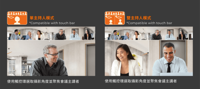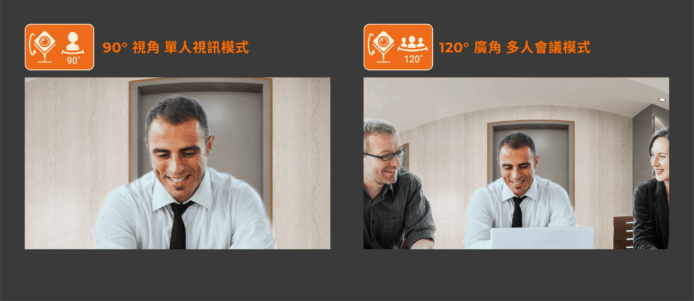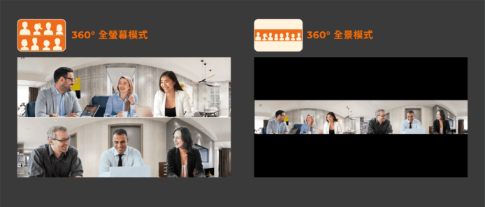 相信唔少朋友都會擔心 360 鏡頭令對方難以看到講者,而 JVCU360 就提供了主持模式,可輕易在機身的黑色環控制主持位置,就可以將講者放大至半個畫面,令會議進行可以更加方便。同時亦有單人及 120 度多人模式,需要的拍攝角度都已經為用家準備好。