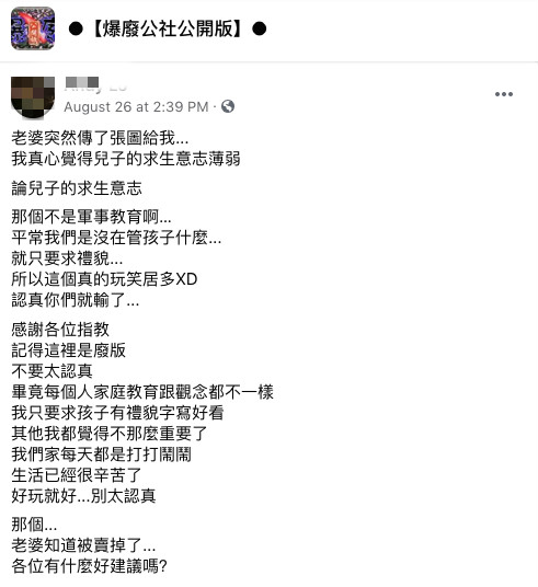 為此,老婆決定不再忍耐,直接使出絕招說「再一次,你都不用吃東西了」,果然這句威嚇馬上奏效,兒子終於如她所願,改口回覆「好的,媽媽。」如此有趣的互動,讓原PO忍俊不禁,笑虧「真心覺得兒子的求生意志薄弱!」他接著還說,其實夫妻倆平常對孩子不怎麼嚴厲,唯一對禮貌很有要求,強調自己不是軍事教育,「真的是玩笑居多,我們家每天都打打鬧鬧的,生活已經很辛苦了,別太認真」。
