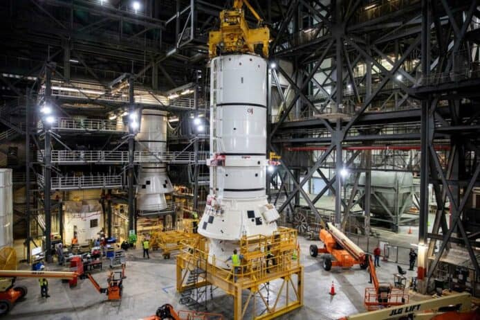 NASA 在日前於官網上撰文更新 Artemis 太空探索計劃的最新進展,表示目前在位於佛羅里達州的肯尼迪航天中心內,太空發射系統 (SLS) 的第一個推進器已經被成功放置在火箭的頂部,為明年的首次飛行任務作好準備,讓火箭在沒有太空人的情況下進行兩次圍繞月球的測試飛行。