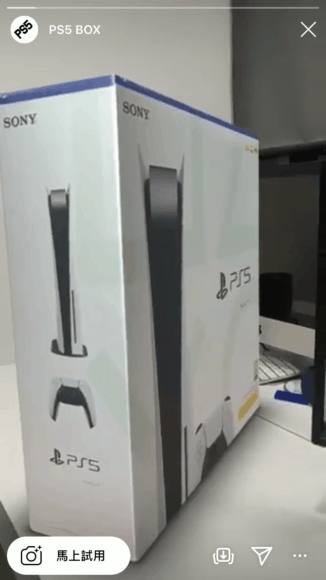 近日 PS5 預訂,不少搶不到的玩家都相當苦惱。但在 Instagram 上出現一個 AR 濾鏡,可以將一部 PS5 的包裝盒放在畫面中,並可以調整大小及位置,而且像真度相當高,即使與真實的 PS5 放在一起也不覺有大差別,最大的分別在於盒上的把手位以及盒右下角的標籤,猶如一部真實的 PS5 放在眼前。