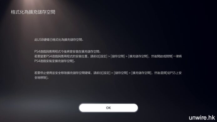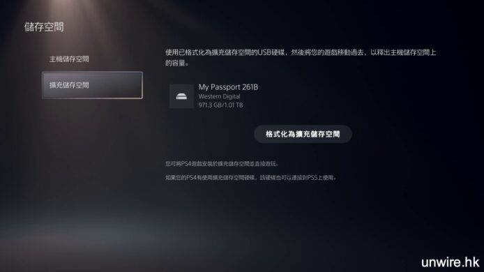 PS5 與 PS4 同樣支援外接式儲存裝置,只要你把足夠快的 HDD 硬碟或者 SSD 儲存裝置,插入 PS5 的後置 USB 插口便可,系統便能正常辨識。如果你的硬碟/SSD 曾在 PS4 使用過的話,可直接插進 PS5 使用,如果你的硬碟/SSD 是新購的話,就需要在 PS5 上格式化才能使用。