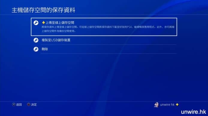 PS4:在 PS4 打開系統設定選單進入「應用程式保存資料管理>主機儲存空間的保存資料」,再決定動作「上傳至線上儲存空間」。依照指示選擇檔案上傳便可。