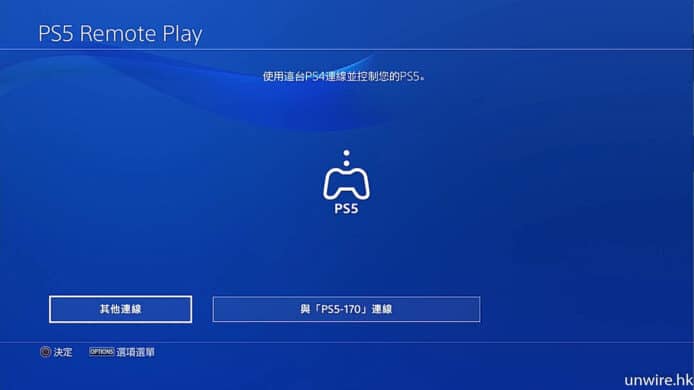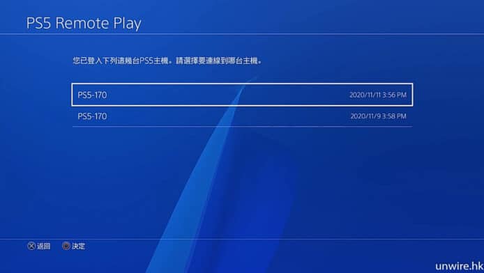 在 PS5 開啟「遙控遊玩」後,便回到 PS4 頁面按下「OK」,畫面會自動跳轉到以下頁面,顯示帳戶已登入的 PS5 主機,請選擇要連線的 PS5 主機。