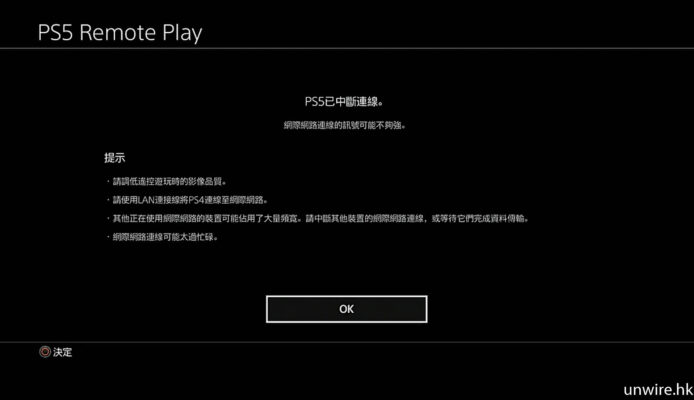 當在 PS4 上使用「PS5 Remote Play」功能時,是無法使用 PS5 DualSense 手掣的。若然在過程中使用 PS5 DualSense 手掣,主機便會自動把主導權給予 PS5,經小編實試後無論無線還是有線手掣亦同樣出現以下畫面,證明 DualSense 手掣與 PS4 並不相容。