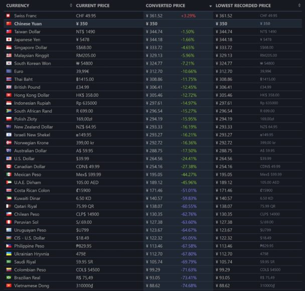 有中國玩家留言「小日本日常操作,就是噁心人」、「Steam 建議中國為低價區,但小日本不領情」、「Switch 版也才 260 元,這是宰豬吧,高貴日本惹不起」、「是不是都覺得中國是人傻錢多?」、「原本很有興趣的,明顯就是把我們當豬宰 」和「這定價搞錯了吧,你們是不是看成HKD了?」。不過 Steam 給予遊戲發行商上架和定價的自由,而定價亦反映他們對不同市場的想法,可能是他們認為中國玩家的消費能力已經超越台灣和香港,直逼售價最高的瑞士。